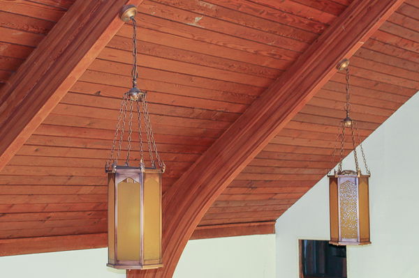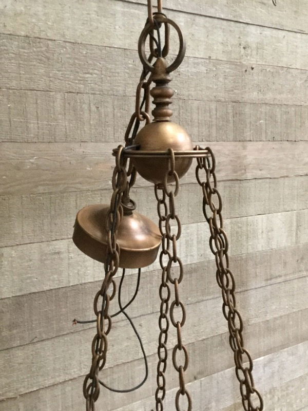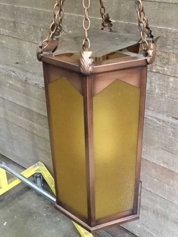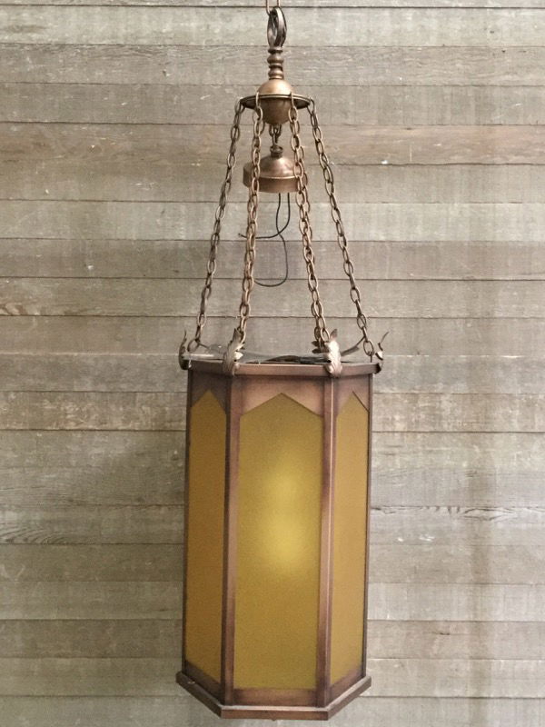 Salvaged from the United Methodist church Grace Cornerstone of Praise, this vintage hanging light comes in a copper finish with translucent amber glass panes in a hexagon shape. Wires are in good shape. Some dirt and scuffs, but in good condition. Picture of it, or it's mates, hanging in its prior location included.