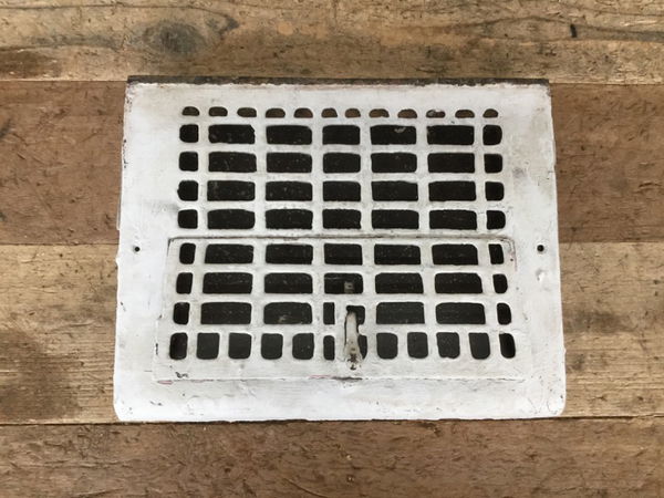 Heavily painted vintage wall-mount heating grate, has a damper flap.