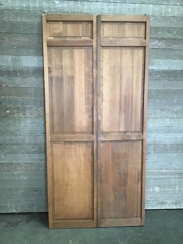 Wood panelled bi-fold door with tracking available in back upon purchase. Has been stained. In fair condition, looks like some of the panelling needs some repair as it's starting to come apart. And looks like there may be a split starting on one of the panels.