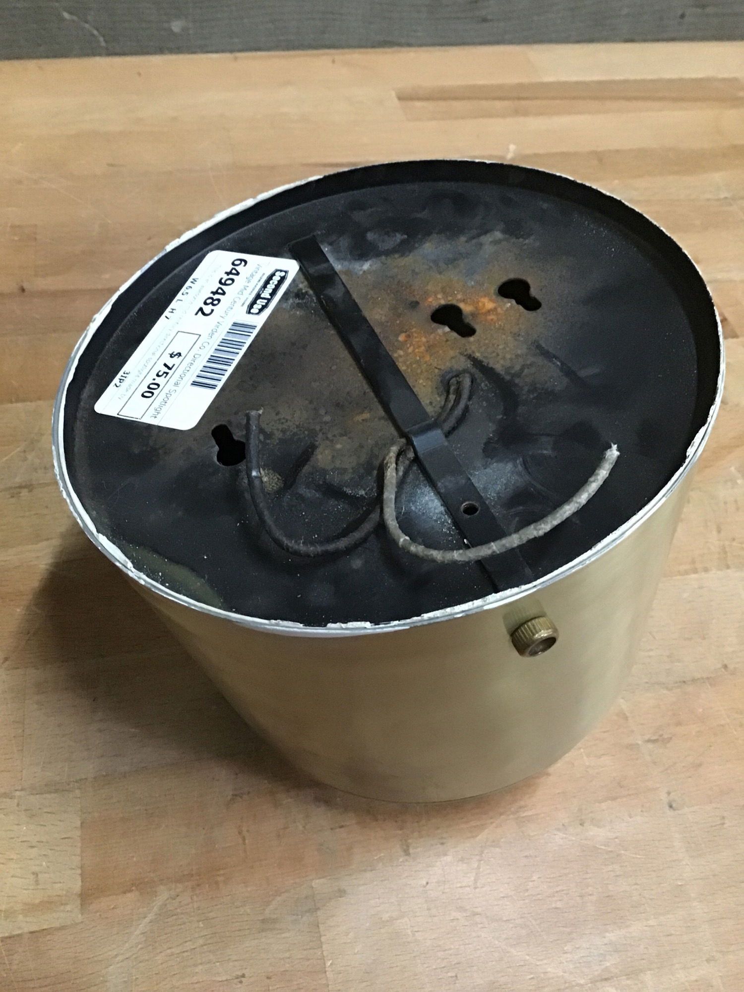 This is an awesome mid century directional spotlight made by John C. Virden Co. This "eyeball" style light is brass toned metal. A little dent in the rim, and is missing one of the wing nuts used to secure the "eye" and potentially a glass cover. Overall in good condition with the original maker tag inside. Needs to be rewired, not tested in house.