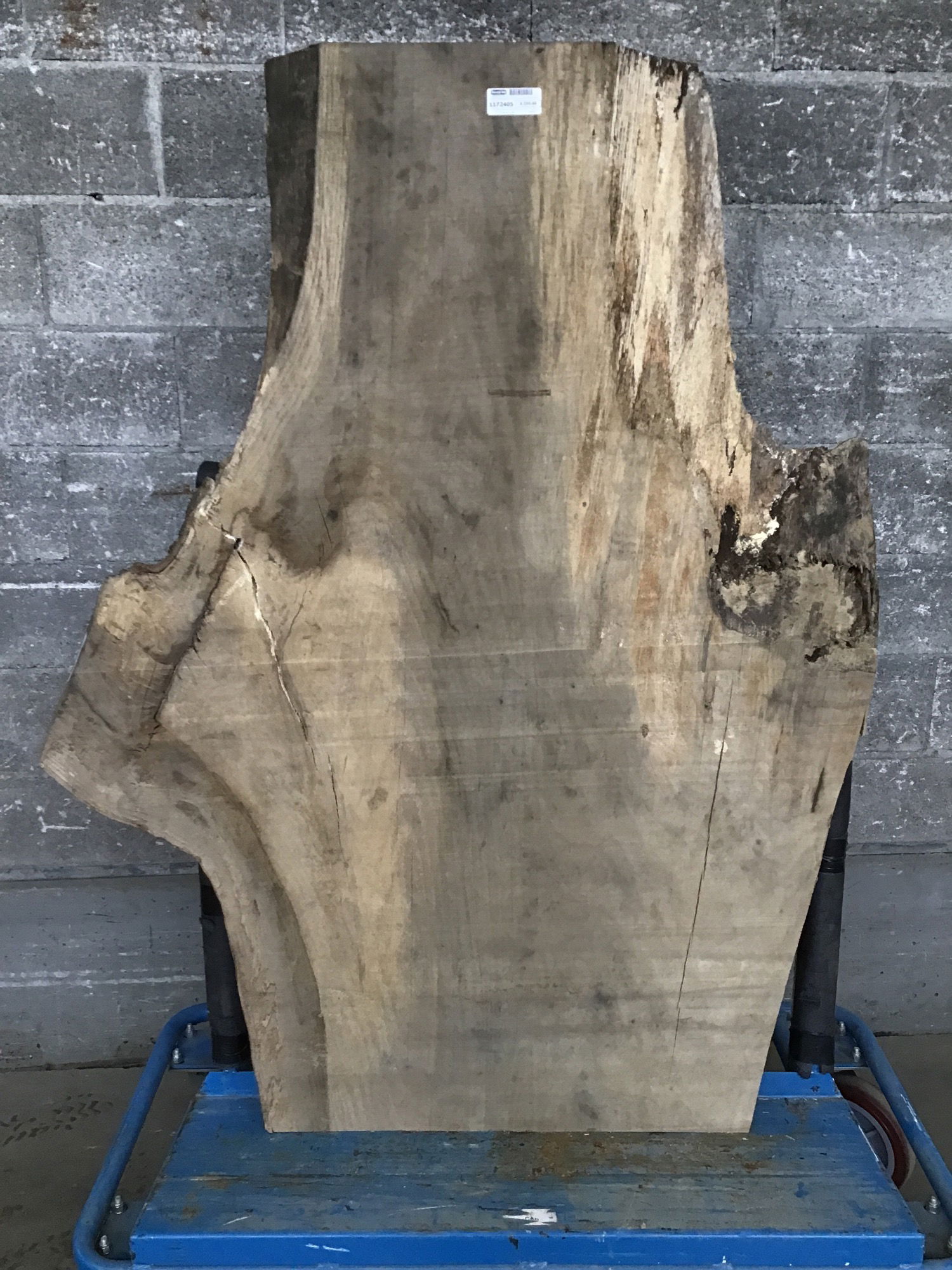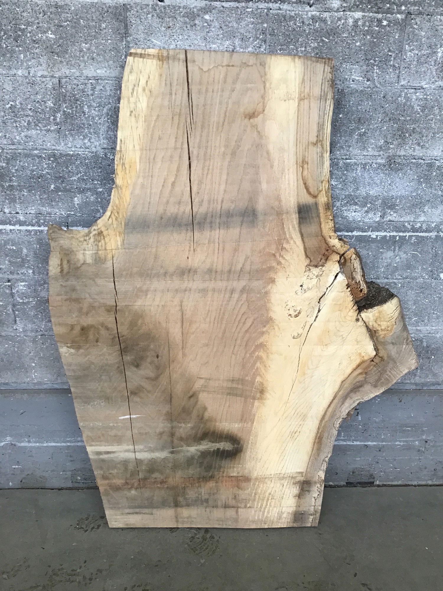 Locally milled and kiln dried. This is a very fine and very large Oak crotch slab with some spalting and figuring like you've never seen before! There is a bit of checking in a few places. The width varies from 23" on one end to 46" at its widest point to 28" on the other end.