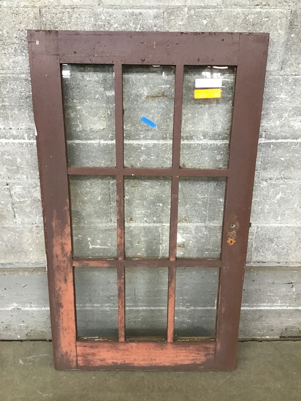 Looks like it used to be a door before being repurposed into a window sash. Nine lites, single pane, true divided. Would be great for a greenhouse.