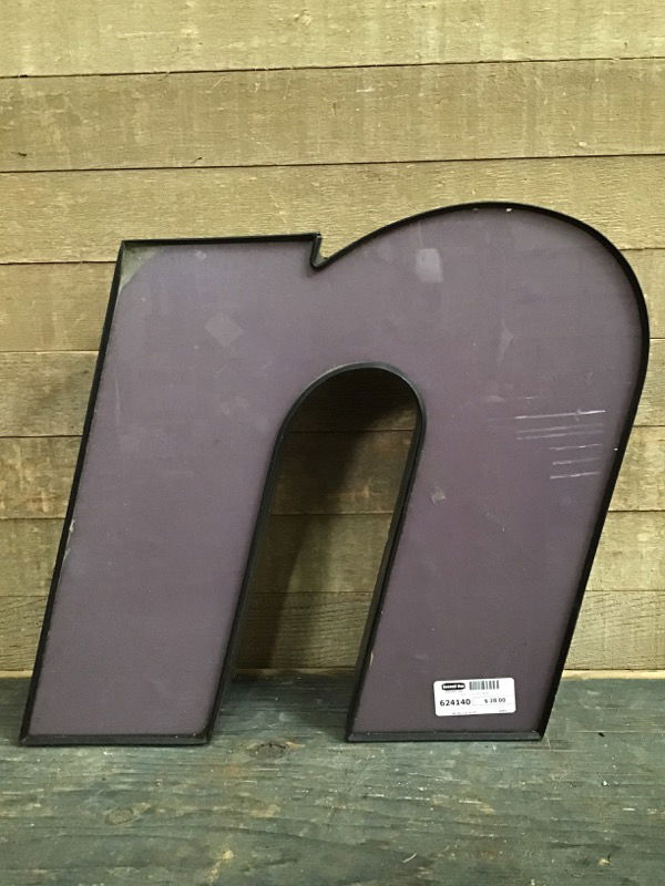 Neon channel letter made of aluminum and purple plastic w/ neon tubes inside. Super cool decor even unlit. Missing screws to hold letter face on, but holds together without them at present. We have no way to test if the neon works.