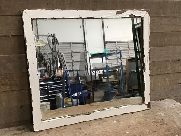 Antique mirror comes painted in white features silvered glass. Some chipping on frame, but honestly adds to its charm. Some desilvering and discoloration in glass, but in good condition overall.