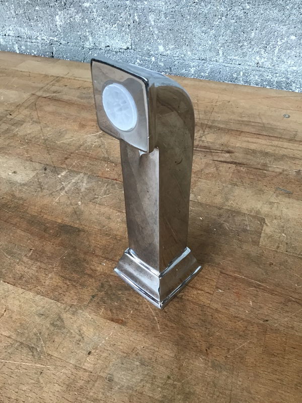 A chrome-finished tub spout that seems to be solid brass. It doesn't have a diverter, and it has a threaded connector.