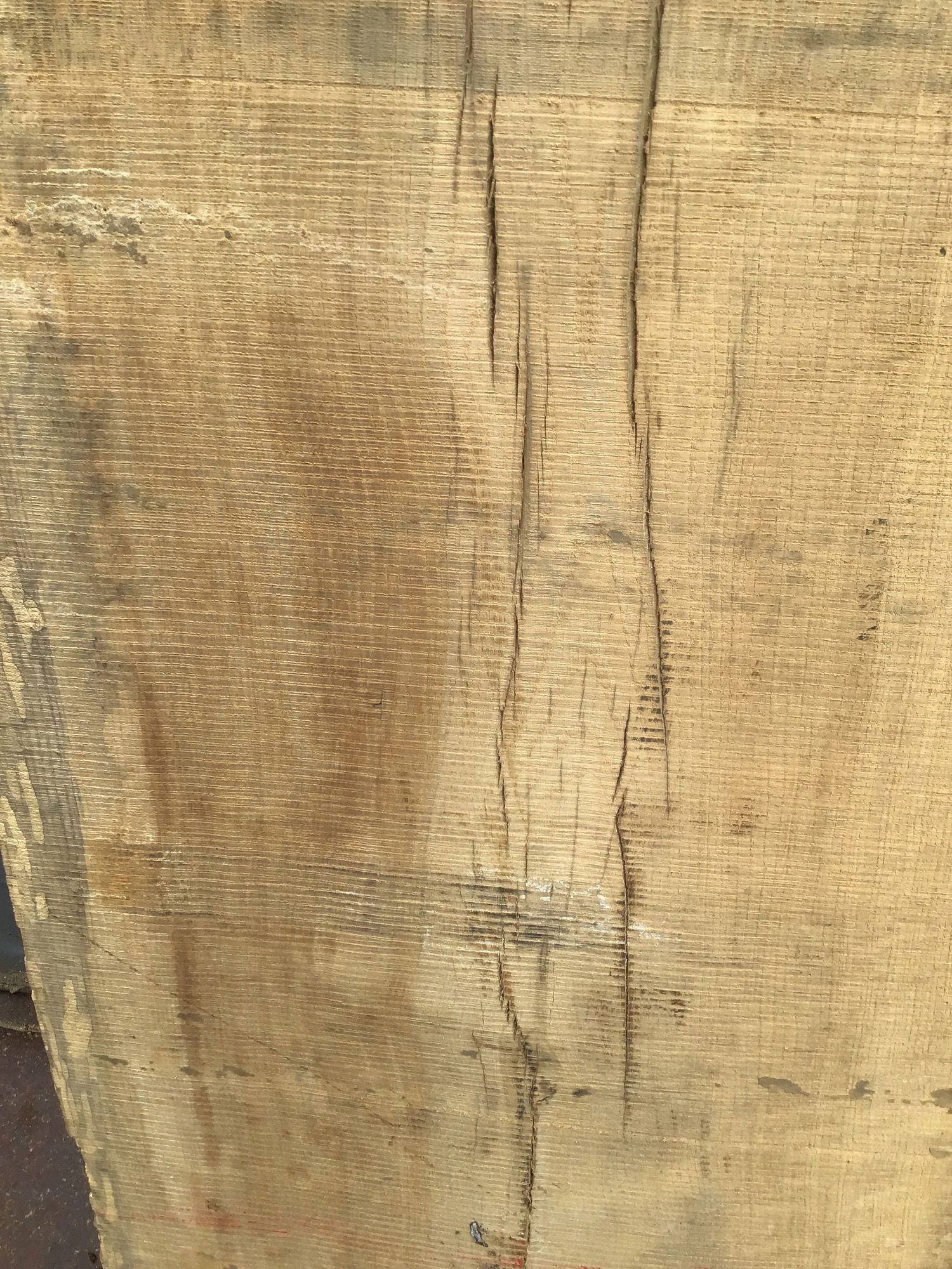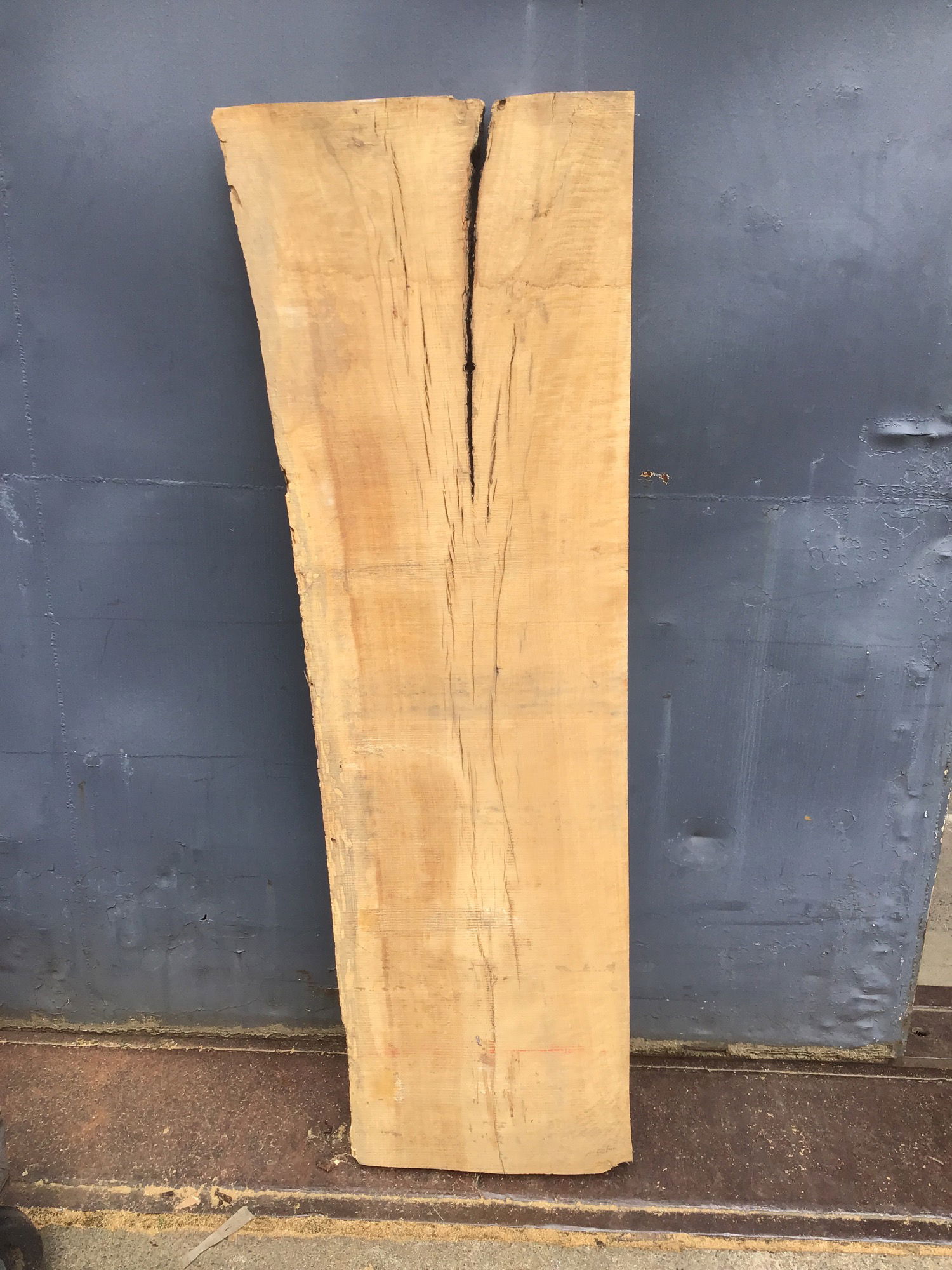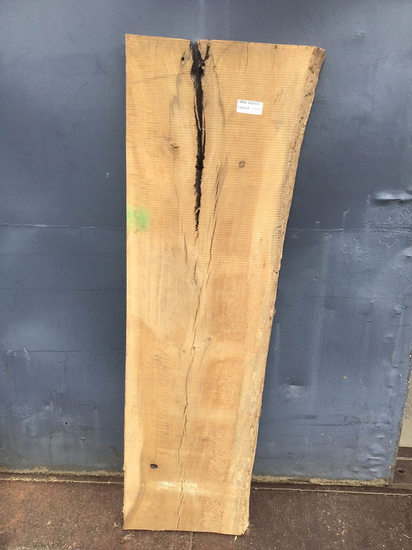Locally milled and kiln dried. This slab has checking down the middle that ends in a bark inclusion, surrounded by some interesting colors. With some epoxy resin and/or a butterfly you could get this piece looking really nice. The width varies from 16" to 19" along its length.