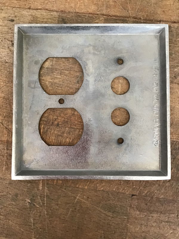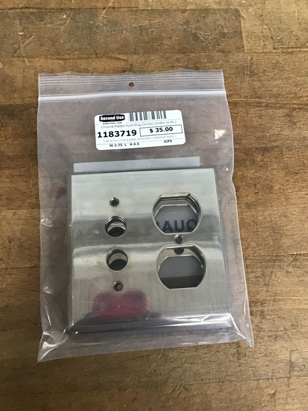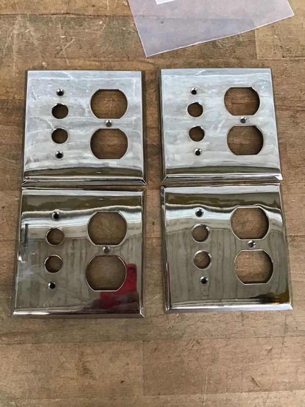 A set of four chrome-plated combination outlet/push switch covers, made of solid brass.
