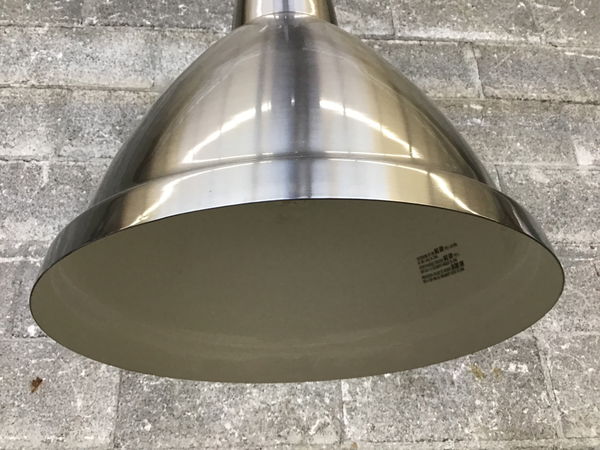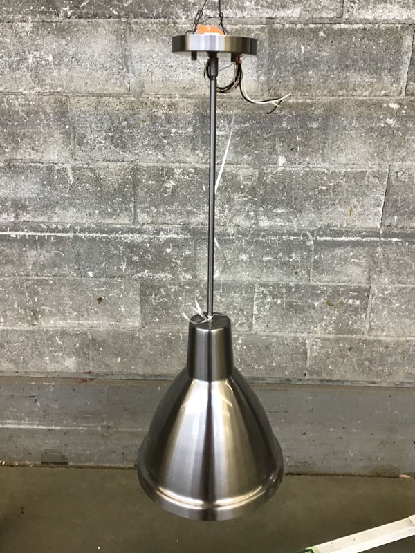 A Park Harbor pendant, part of their Whitnall line, with a natural steel finish. It sports a single bulb and can be mounted on a slanted ceiling.