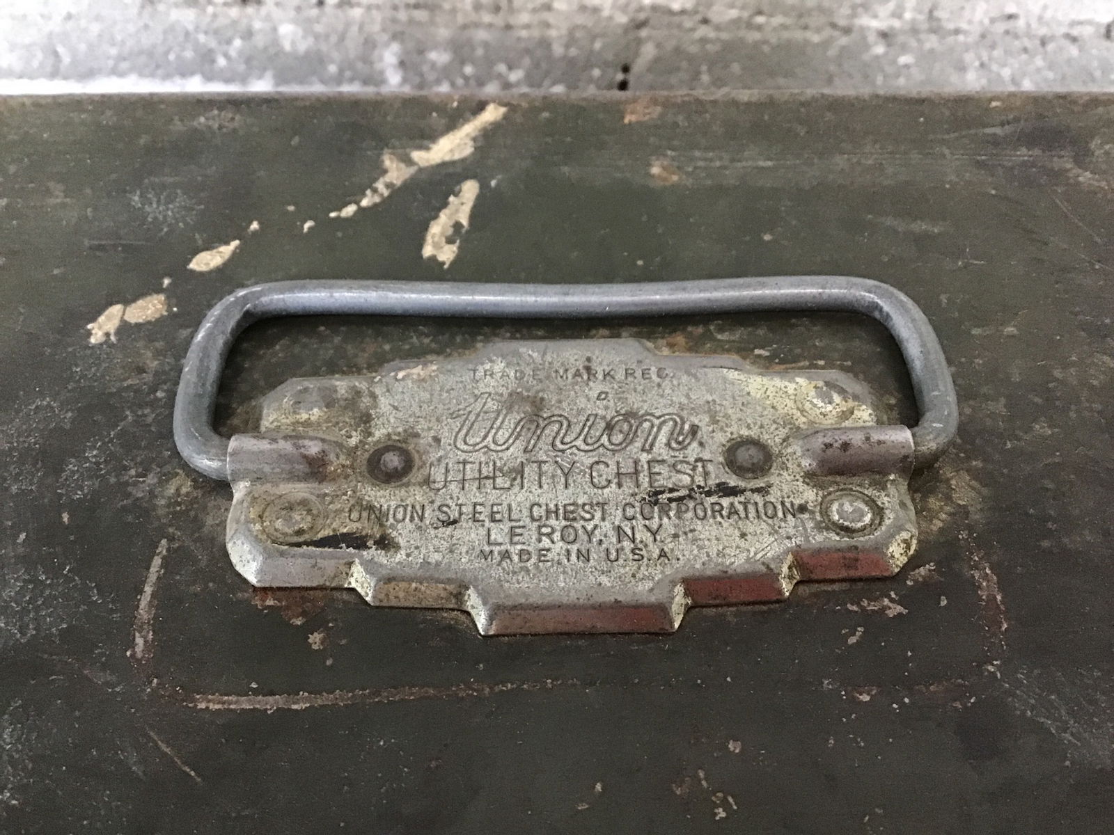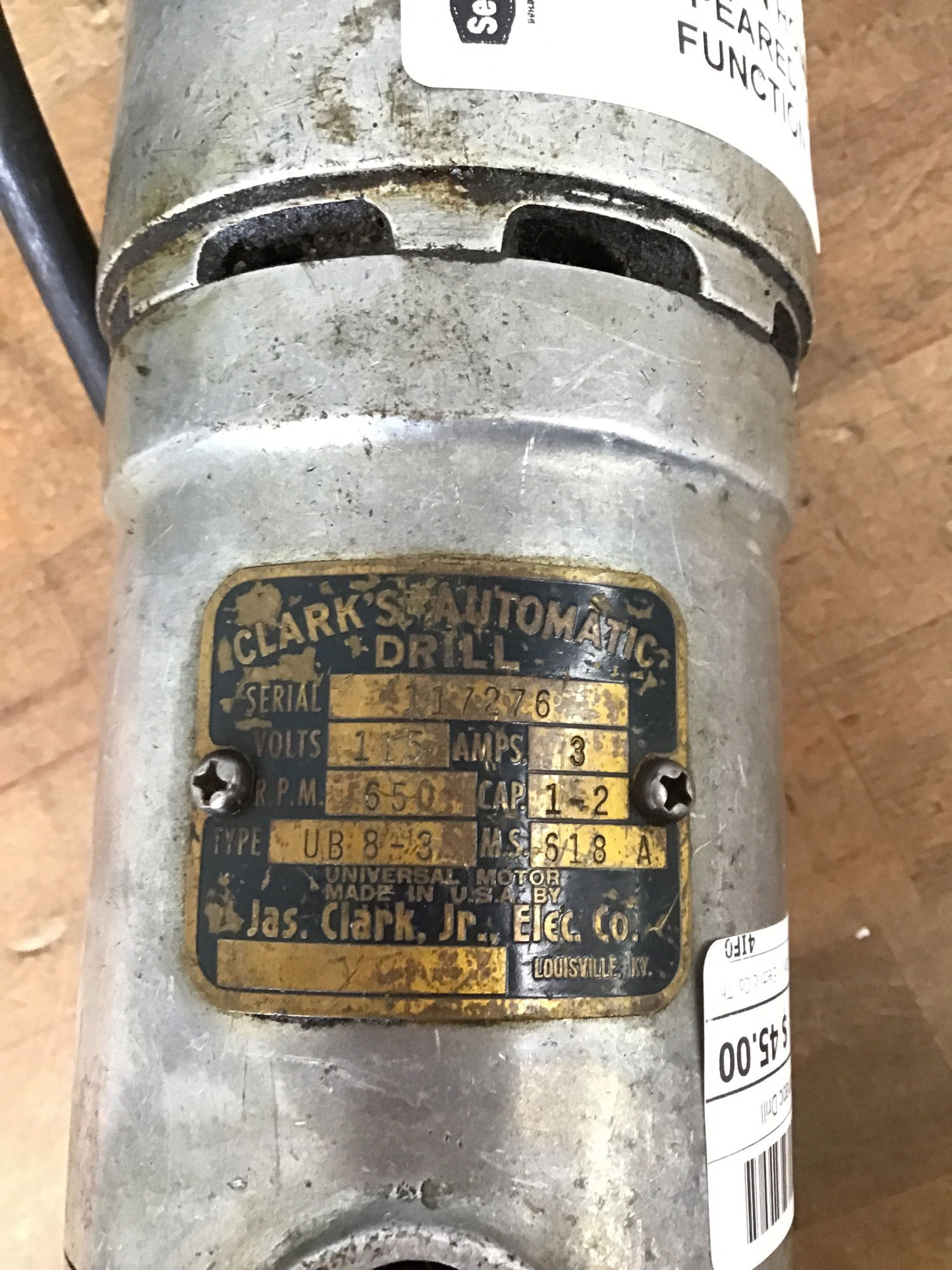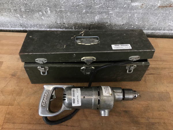 Beefy vintage corded drill by Jas. Clark Jr. Electric Co. This comes with a green steel carrying case marked "Union Utility Chest." This was tested in house and appeared to be functioning. Dimensions listed are for the case.