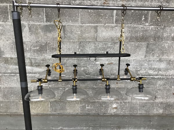 A classy and modern chandelier brought to you by Kohler from their Tone Collection. It sports eight lights, arranged in rows of two with domed clear glass shades and a matte black and brass finish to its construction. This unit is in good shape, with only one or two tiny little marks I had to look for in order to see, with all of its components intact and in a great aesthetic shape. This model retails new for around $1,200 here.