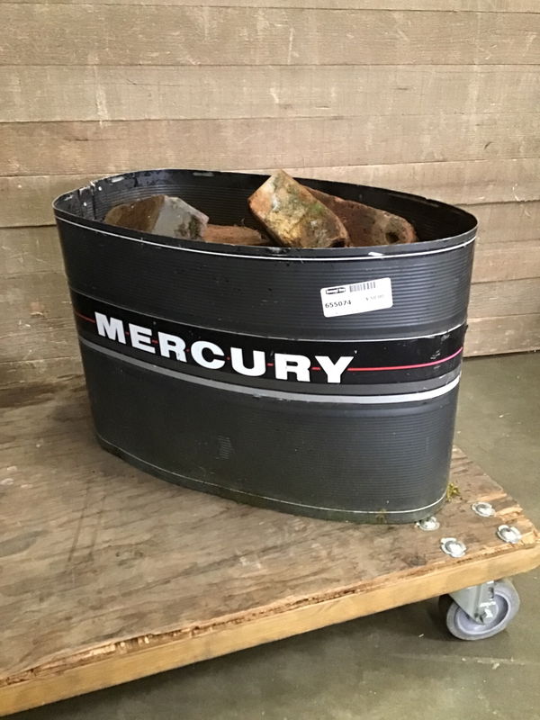 Very creative planter made out of the cover of a Mercury outboard boat motor. This hails from the local restaurant Boathouse 19 Bar and Grill, and is full of soil, and ready for a plant of your choosing!