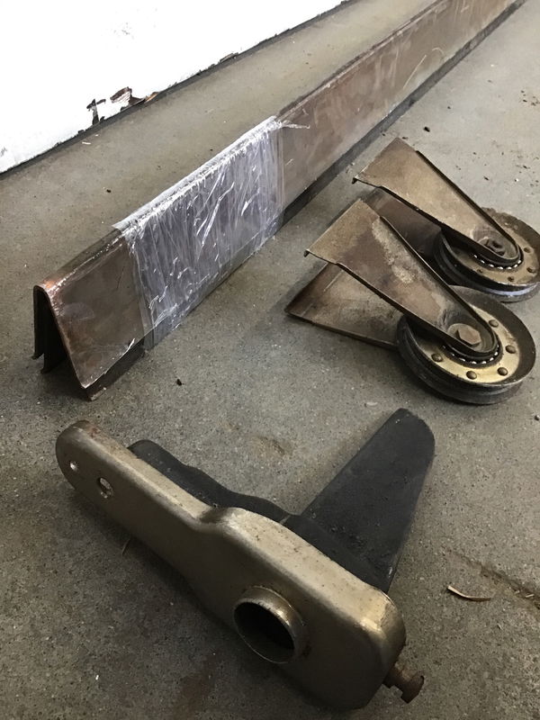 Vintage pocket door with unique track and rollers. Does not have a key, but if you find a skeleton key that fits it in our cashier room, we will include it in the sale of this set.
