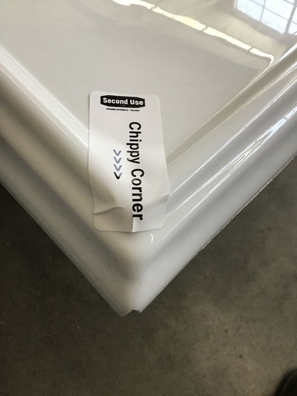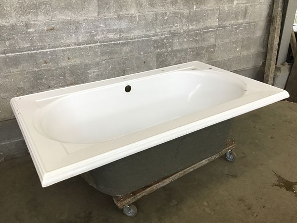Kohler Memoirs fiberglass soaker tub that is still nice 'n' shiny but does have a few minor flaws. There is a little chip in one corner and a handful of light scuffs and scratches. Luckily, the chip will more or less be hidden once installed and the scuffs are ones you really have to look for. These retail for $1700+ online, so if you can live with a few imperfections this is quite the steal!