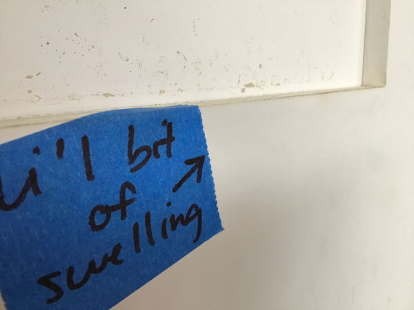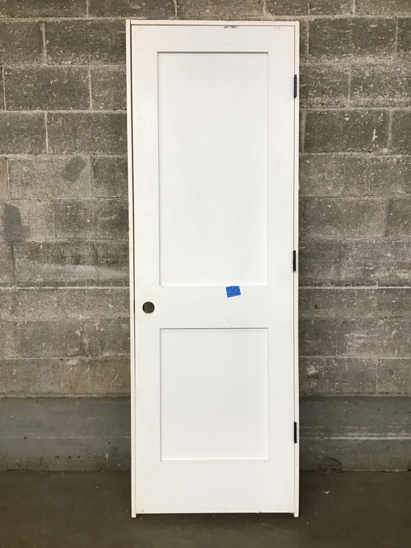 Shaker style primed masonite interior door in jamb. Looks like this has never been installed, but there is some cosmetic damage from storage as well as a tiiiiiiiiiny bit of swelling at the edge of one panel.