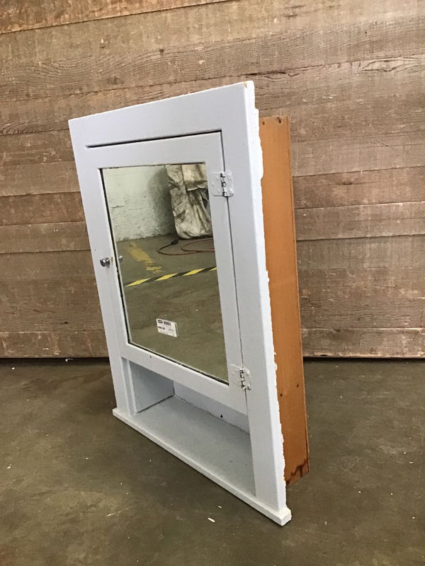 Vintage Fir built-in medicine cabinet with a mirrored door and spaces for shelves inside. Face is painted very light blue. May be missing doorknob or shelves. Photo may be representational. Check here for more info about this project.