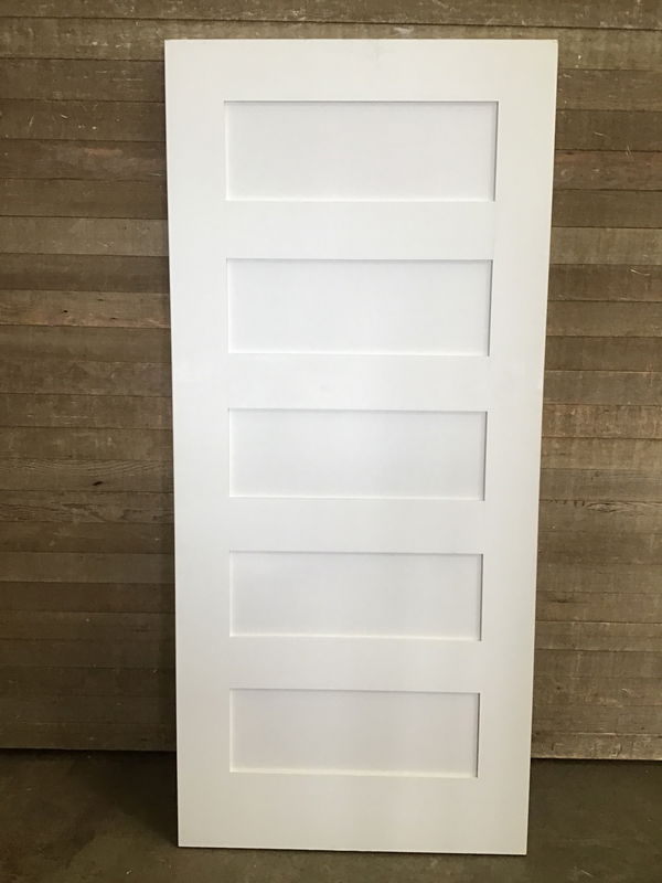 Never installed 5 panel shaker style masonite door. Thick interior door with one side cut down fractions of an inch.