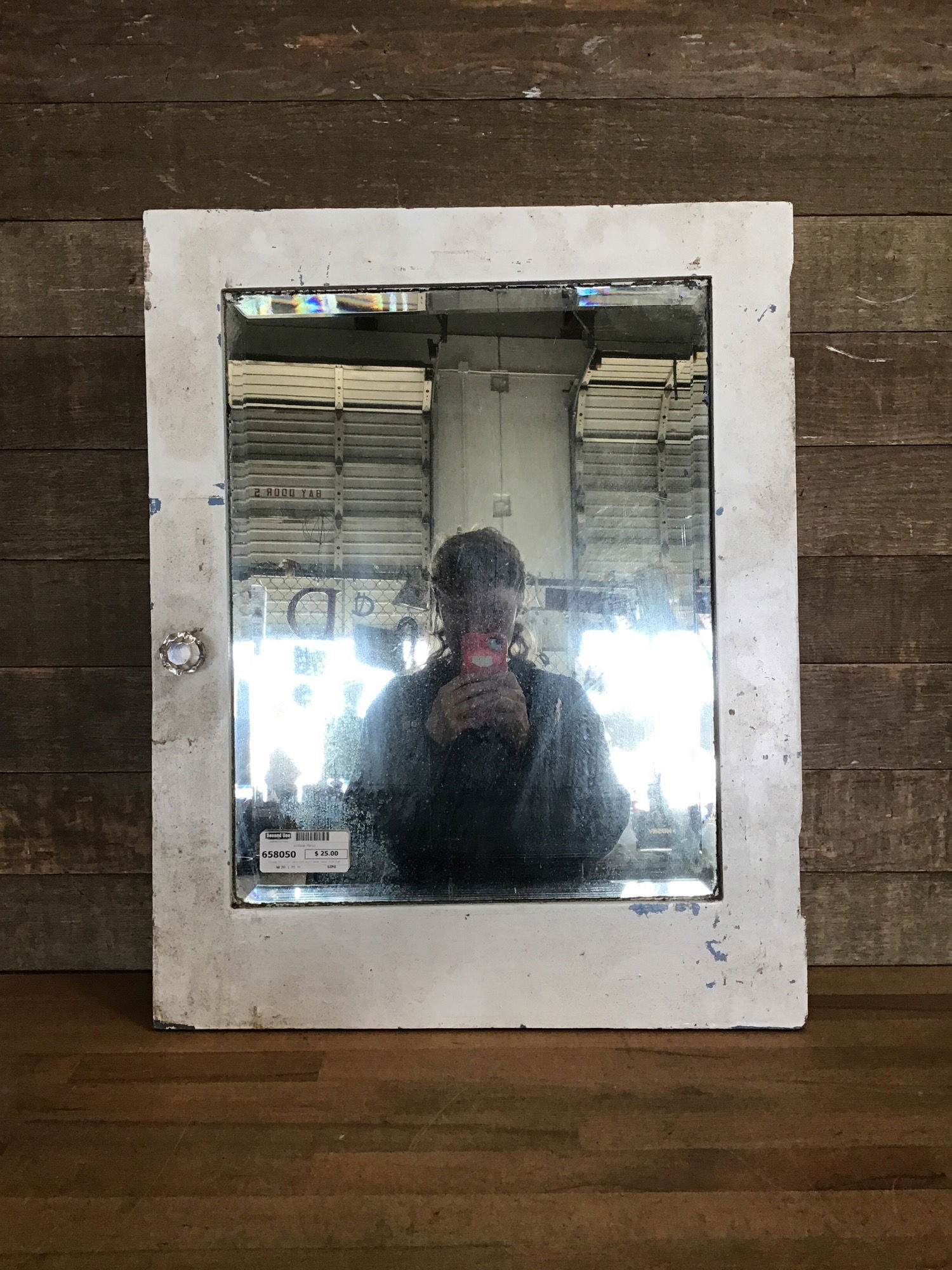 Vintage mirror with glass knob and a white frame. A bit dusty but otherwise looks in good condition!
