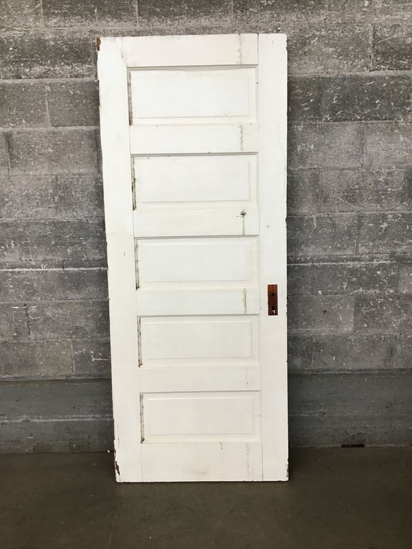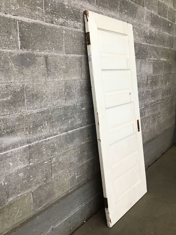 Multi-panel vintage door. Quite heavy with a paint job to match - several layers have been applied over the years. The hinges have been modified, so the door can swing whichever way. Some separation starting between the rails and stiles. Will need some work before hanging.