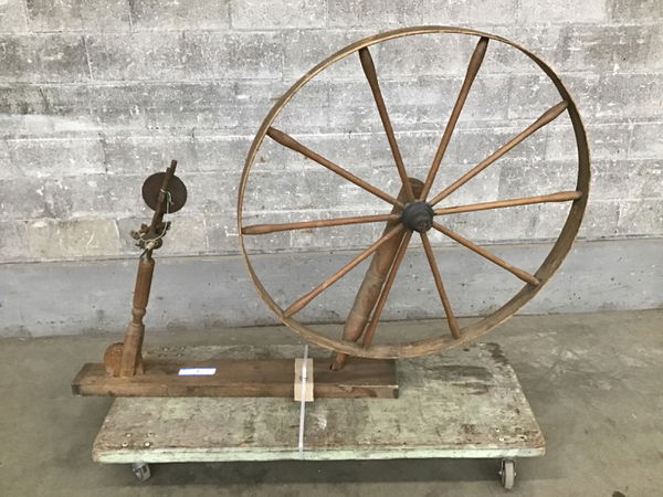 Handmade antique spinning [walking] wheel, made by Peter Perry Crosby around 1865 in Markham, Ontario. Looks like a few different types of hardwoods, it has simple yet elegant detailing on the table and support spindle. Unfortunately missing its legs (or possibly intended to sit directly on the floor), but looks like it has all the parts to make it a functioning piece.