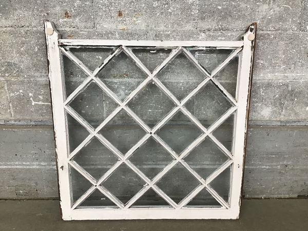 Stunning, diamond-paned vintage sash window with heavy paint, and deteriorating glazing putty, overall needs some cosmetic attention, rice reflects.