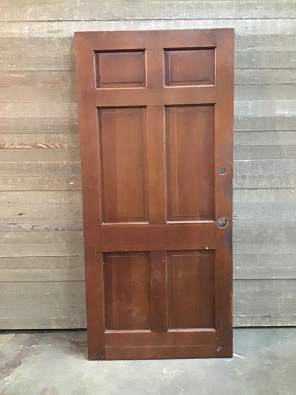 Vintage fir exterior door. Panels have some splitting on one side but it hasn't gone to the interior facing side so they are still intact. Colored black on one side and a clear finish on the other.
