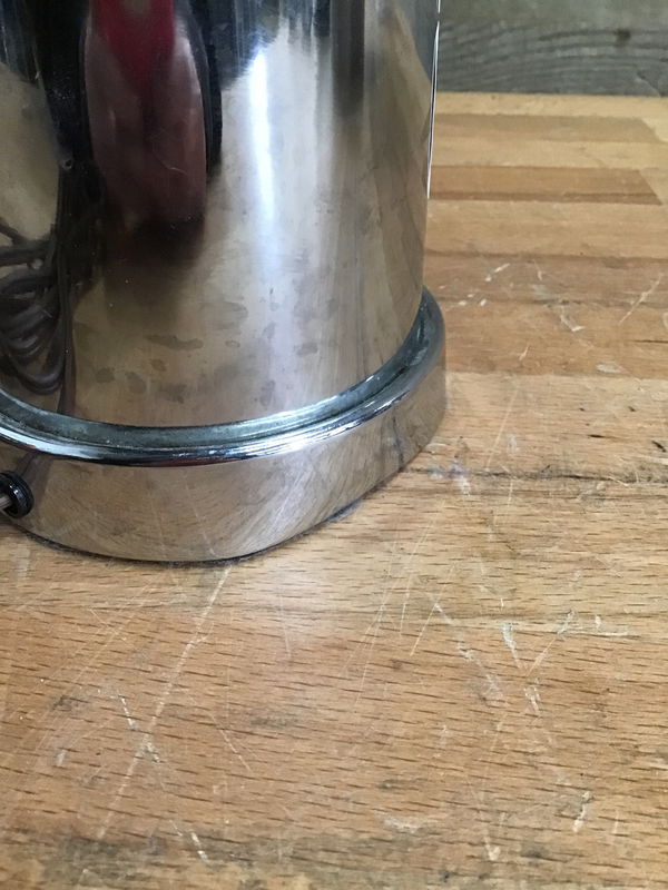 This is a mid century cylindrical steel table lamp. Tested in house and appears to be working okay. Width of lamp shade frame is 9" Appears to have been dropped at some point due to a dent at the bottom. Check here for more info about this project.