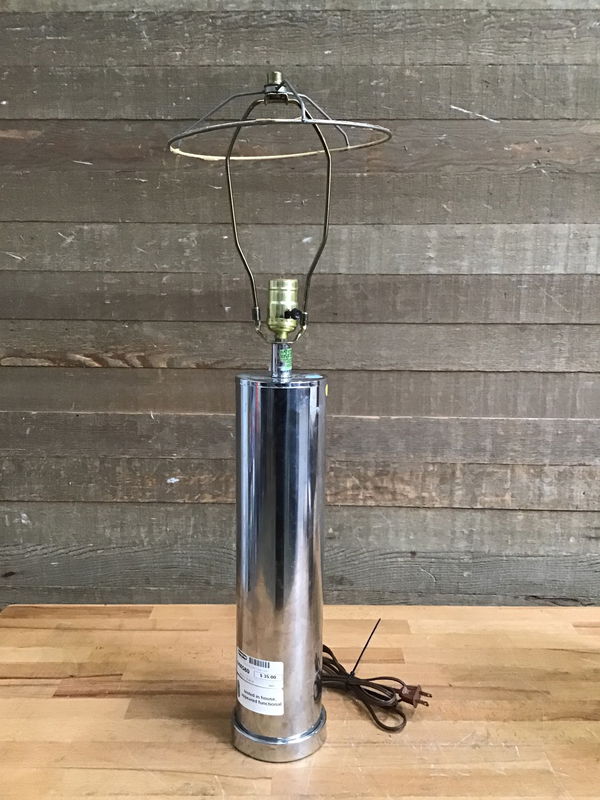 This is a mid century cylindrical steel table lamp. Tested in house and appears to be working okay. Width of lamp shade frame is 9" Appears to have been dropped at some point due to a dent at the bottom. Check here for more info about this project.