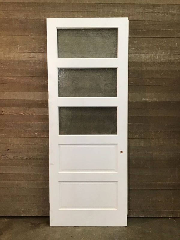 Tall half lite door with three textured glass panes. Was previously a second door in a pair, has astragal. No significant damage, just the usual wear and tear.