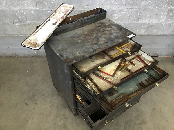 This rolling metal tool chest is well seasoned to say the least. It has seven drawers that slide easily, a work surface, and a top compartment with a lid. The drawers have fun heavy-duty pulls, and the top four have custom slots and compartments for tools and components. Maybe it was used for electrical and lighting? Or at a machine shop? It's industrial-chic for sure and just begging for some steel wool.