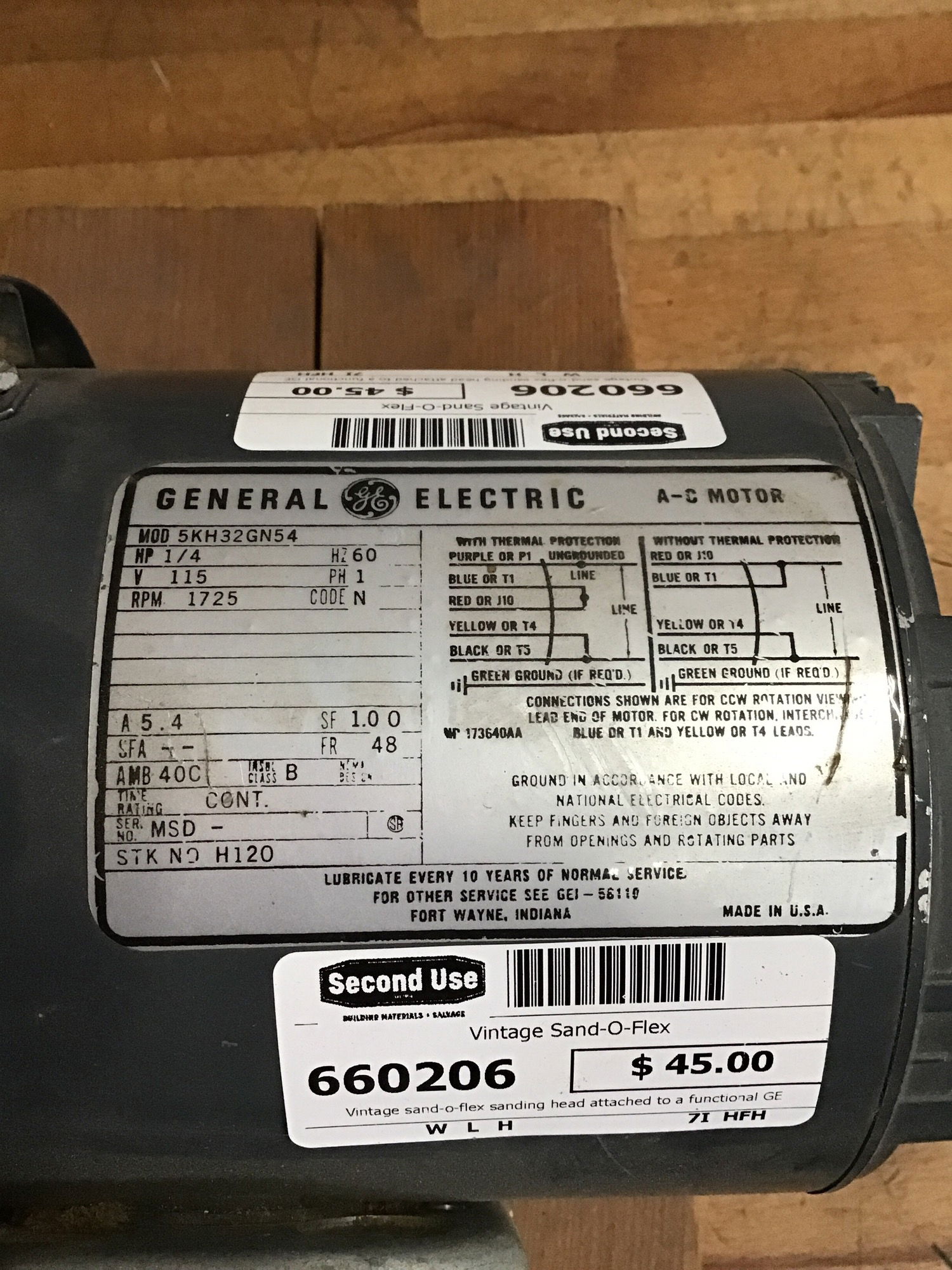 Vintage sand-o-flex sanding head attached to a functional GE 1/4HP 1725RPM AC motor.