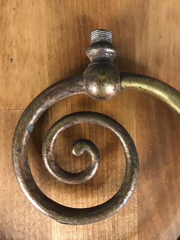 A Victorian era brass antique scrolled gas lamp arm. Sold as parts.