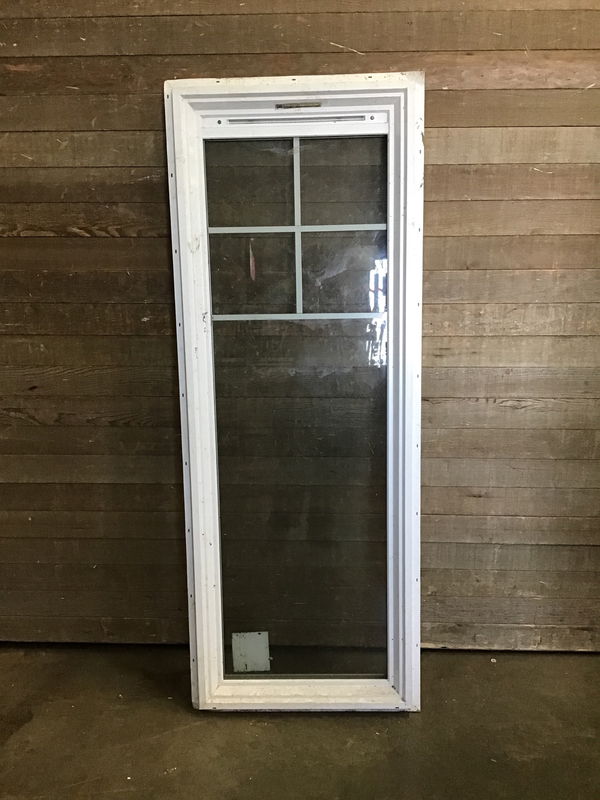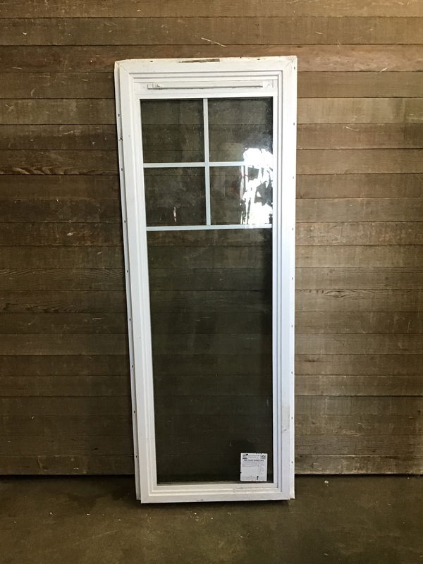Vinyl fixed window with nailing fins and a pattern in the panes to give it a faux divided look. Could use a cleaning but in otherwise decent shape.