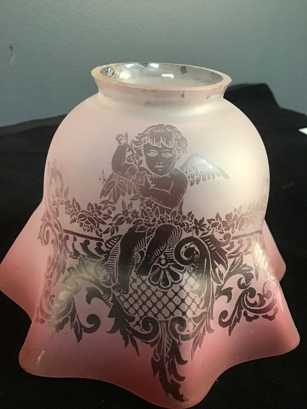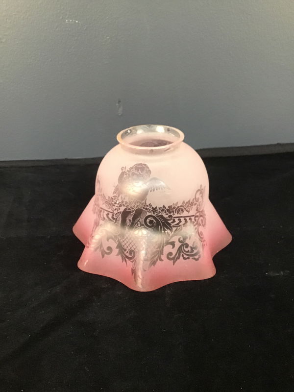 A sweet antique glass shade for a gas (or electric) fixture. Has an etched pattern with cherubs on the clear glass and the ruffles are pink. So cute! Possible Vianne