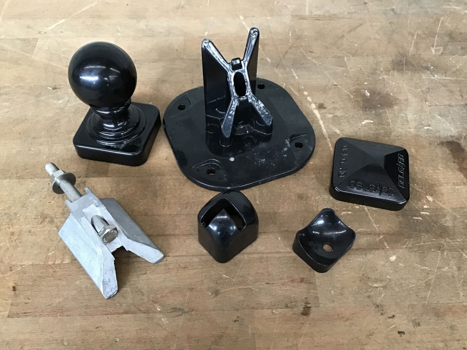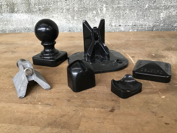 This black aluminum fencing kit is definitely a collection of leftovers from someone else's project, but there's a few good pieces to get you started if you're working on a small fence or railing. Included are seven flange pieces (some sort of post base I think), six ball finials, four square post caps, and eight angle adjustable brackets that I believe are for balusters.