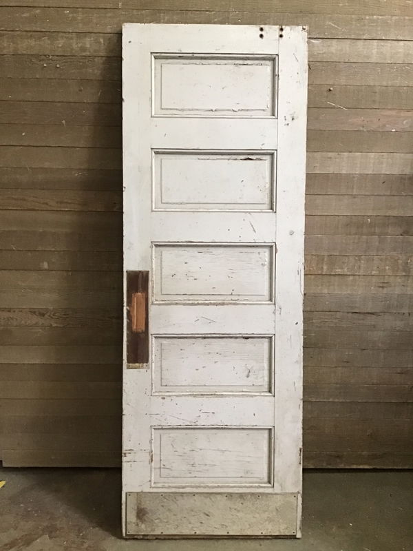 Vintage 5 panel fir exterior door in solid shape including the panels. Paint is flaking off and will need a refinishing.