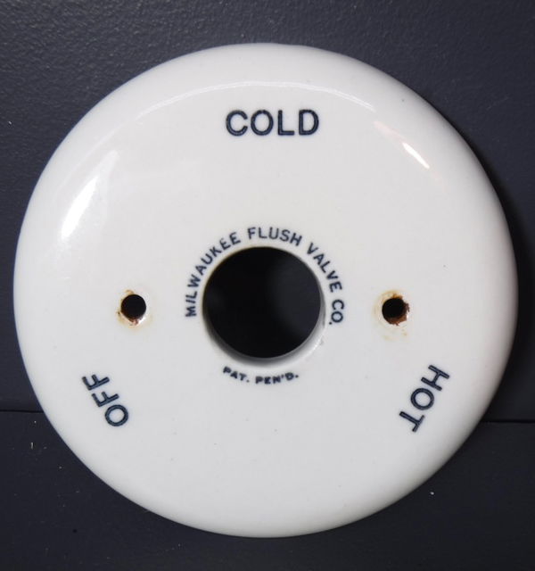 A Milwaukee Flush Valve Co porcelain mixer valve cover. In good shape for it's age!
