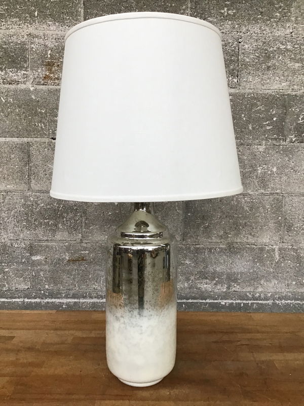 Made by Ballard Designs, this large mercury glass table lamp originally retailed for over $400. It offers an ombre color gradient from white to silver, a matching mercury glass ball finial, and a crispy clean white lamp shade. #RoyalHunter