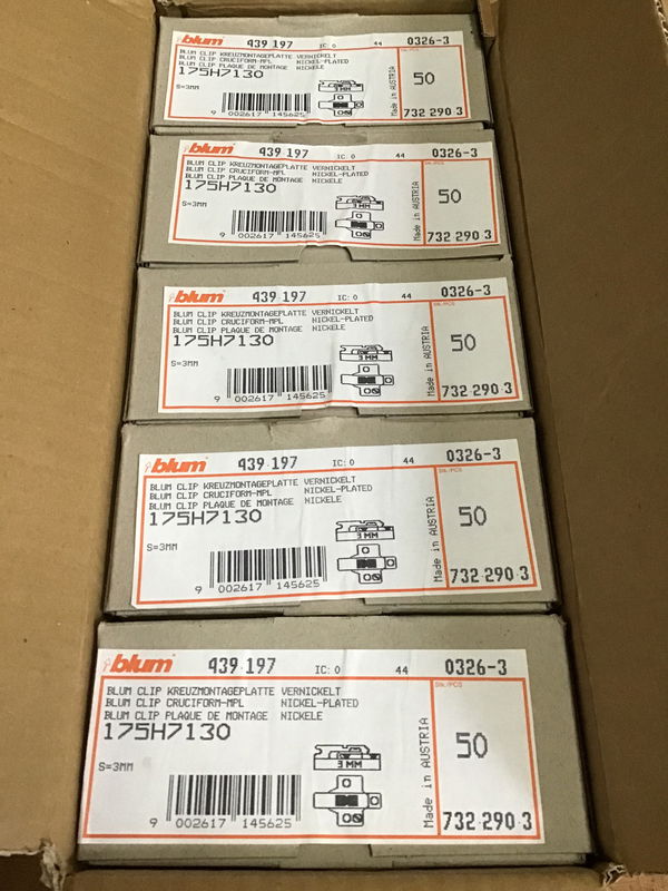 New Contractor Box of Blum, nickel-plated mounting plates. There are five boxes of 50, for a total count of 250. These sell at about $1 each online, see here.