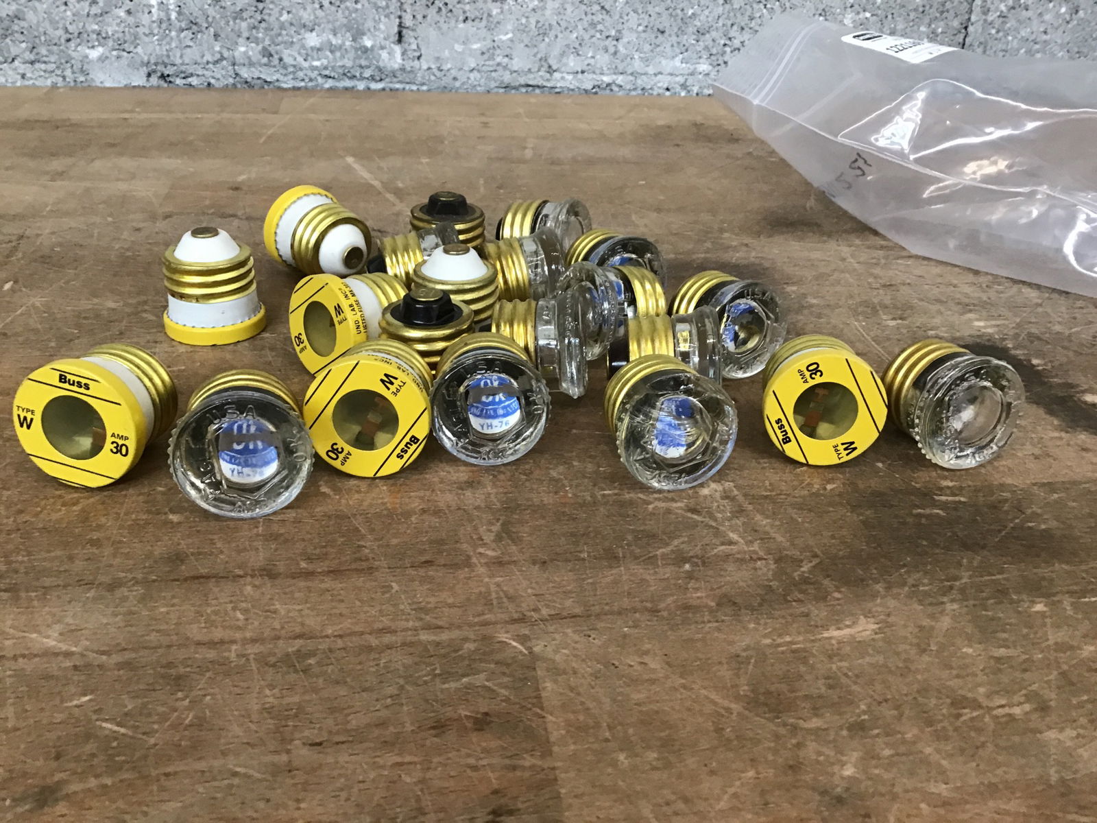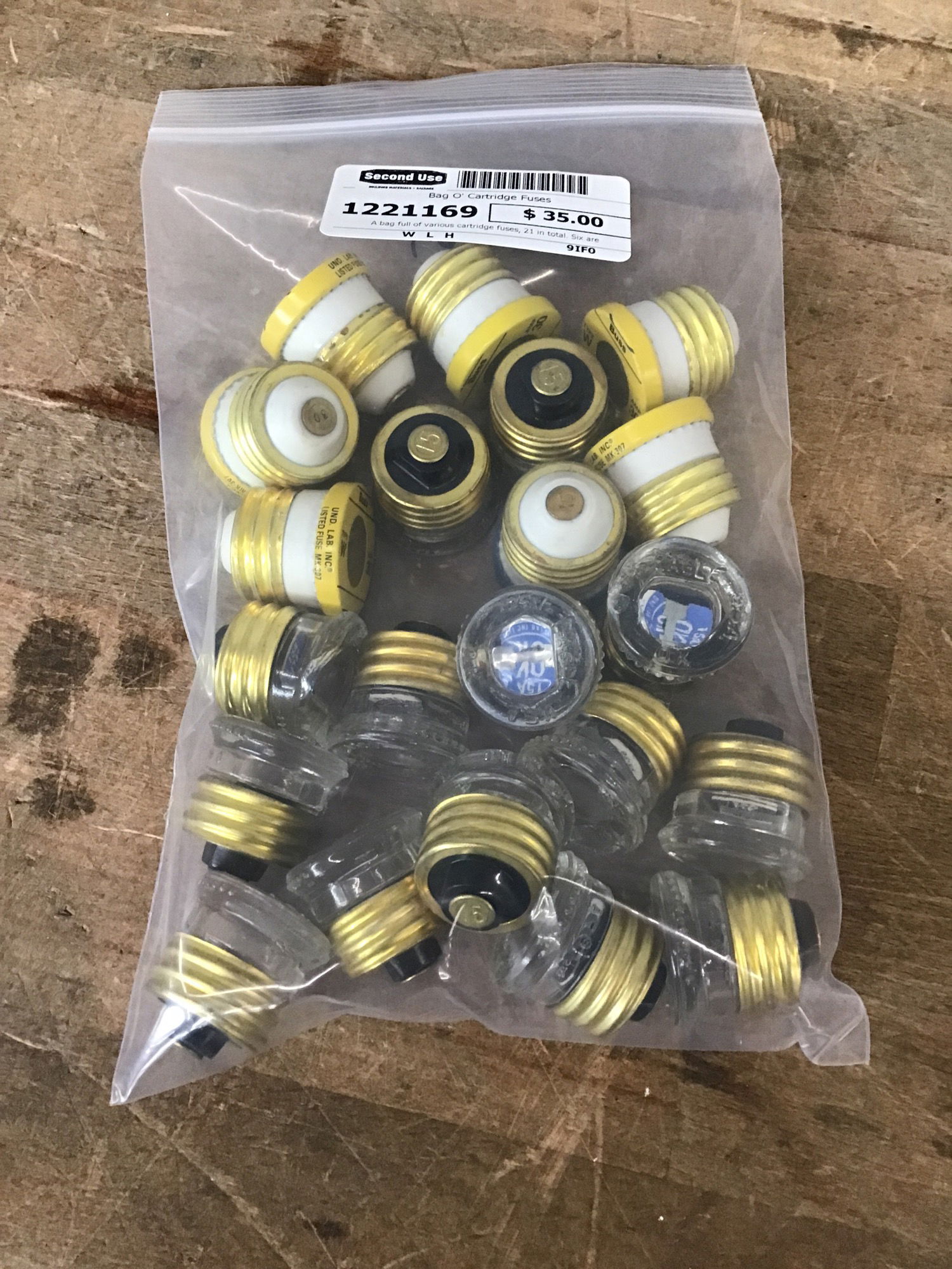 A bag full of various cartridge fuses, 21 in total. Six are 30A, another six are 25A, and nine are 15A. Some are Eagle brand, others are Bussmann, which typically retail at about $10/pop.