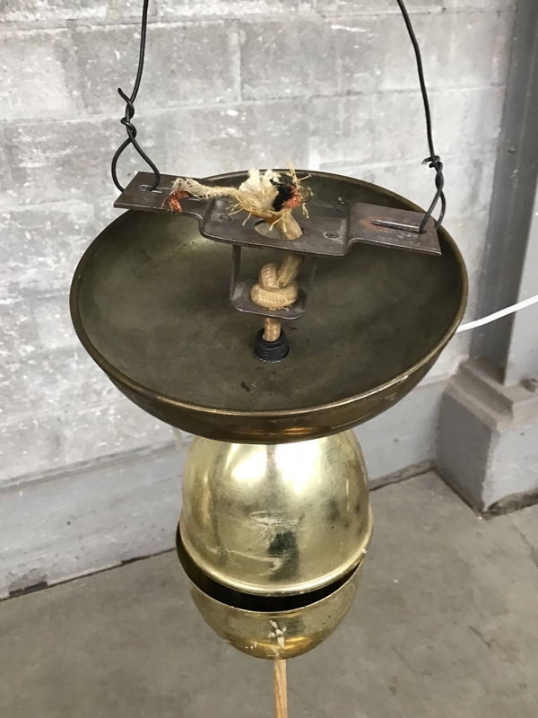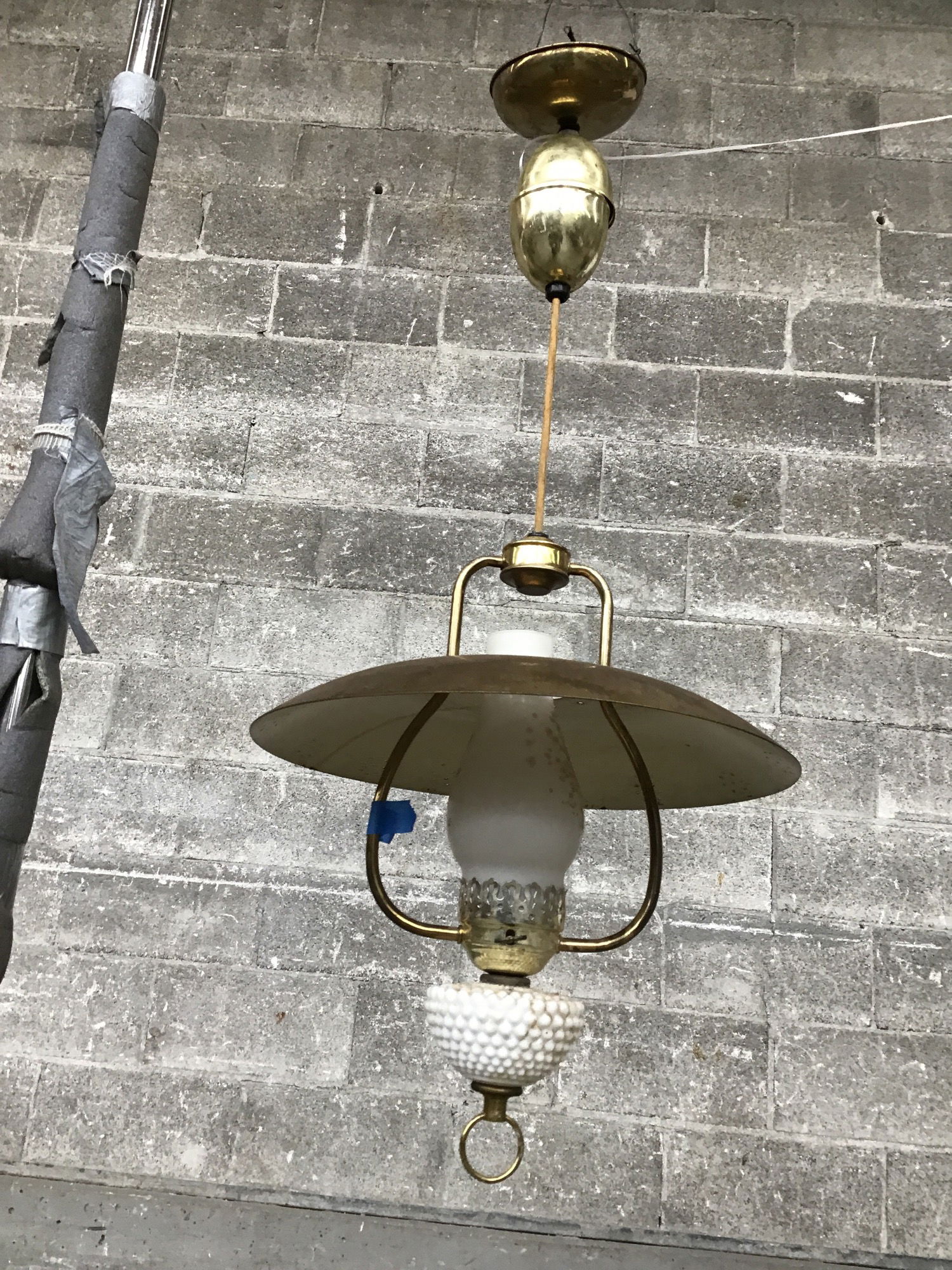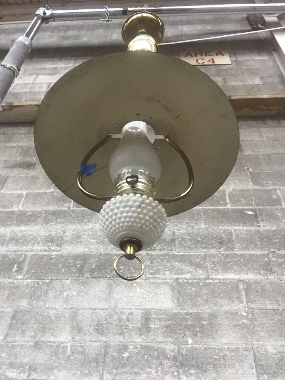 MCM pull down light that has seen some things. It's got significant rust and grime on it's brass shade and hob nail glass body. However it as an intact hurricane shade! It would be a fun project if you're looking for that rustic vibe! Price reflects condition.