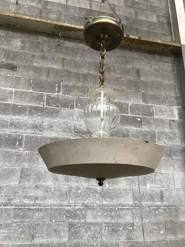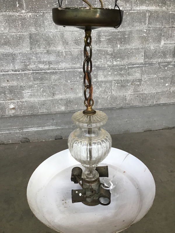 A vintage glass and metal pendant with a painted metal shade. Four light sockets. A little dusty and we're uncertain of the wiring. It's giving old farmhouse dining room, and could be a fun project. Shabby elegance, priced to move!