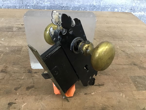 A vintage mortise set complete with the mortise box, a spindle, two vintage brass knobs, and black gothic escutcheons.