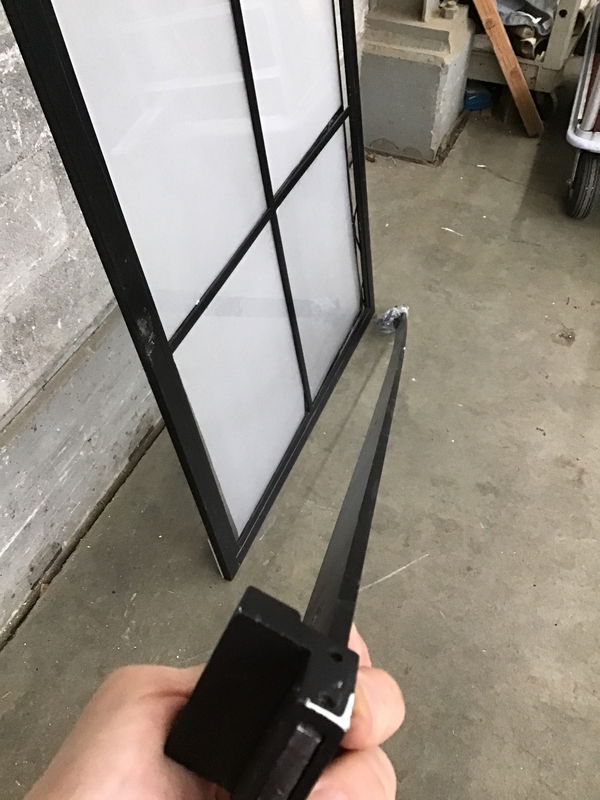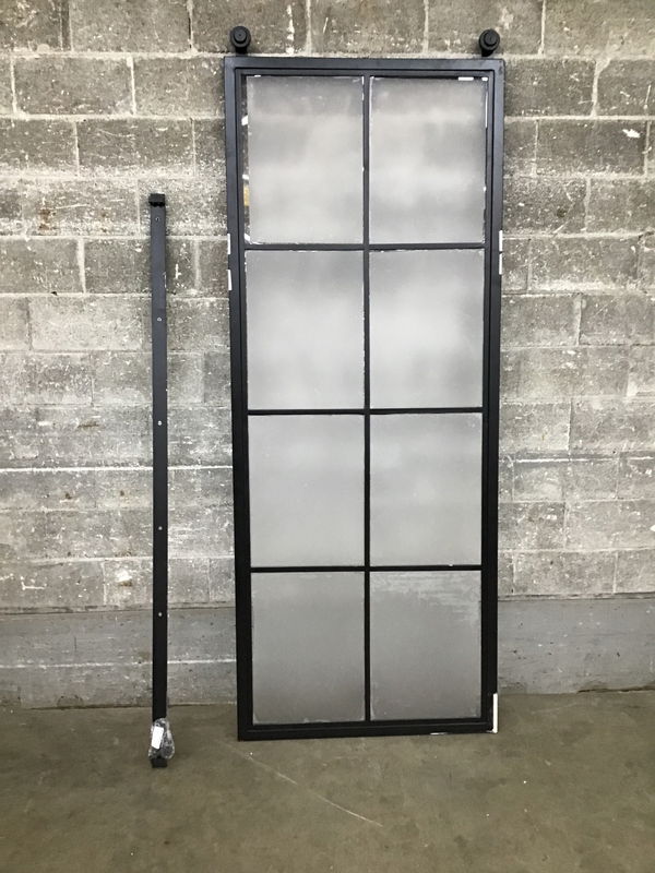 Sliding glass barn door with track and all hardware for an easy install. Includes 79.75" of track. Listed measurements are for the door with attached rollers. Note: The door is made out of steel and the hanging roller hardware is welded to the frame. The glass is faux divided and has obscured film on the glass that can be removed if you'd like it clear. The "glass" has come loose a little from the frame (see fourth photo), and looks like it was just installed using double sided tape. You might need to get some more.