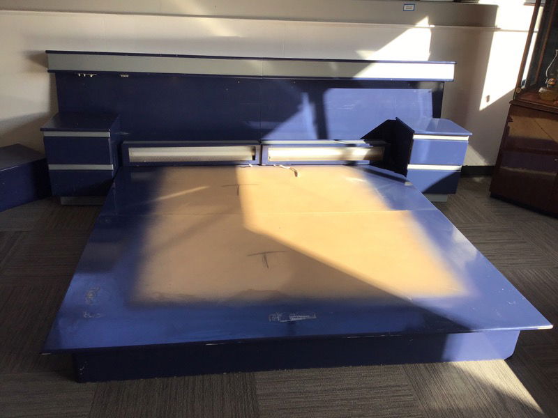 This Lacquered Periwinkle piece 1980's Deco Revival Bed Frame really speaks for itself. A queen-size platform bed with a floating headboard. This was a custom job and was very well built. Unfortunately, this beauty was not maintained so well and all pieces have some cosmetic damage in the form of scuffs, scratches, some chips to the lacquer here and there, and some water damage. The headboard was wired for electricity and includes 2 downlights. Damage aside, is a once in a lifetime find and is absolutely worth saving. Will you answer the call? (It's coming from a 1980's car phone.)