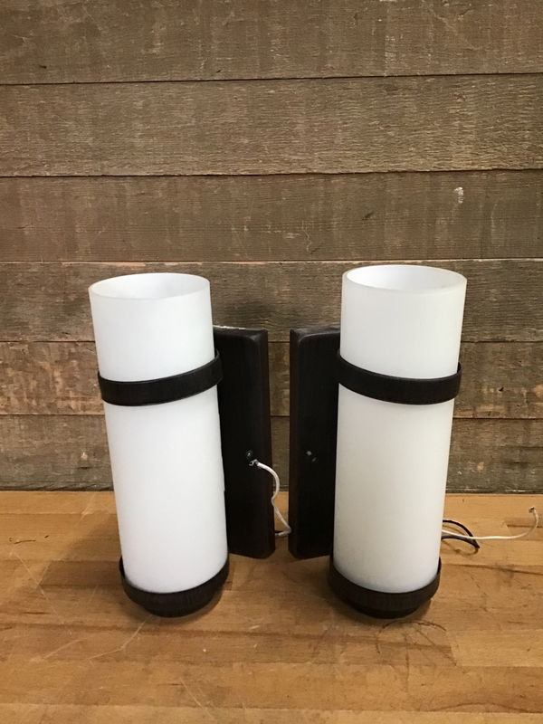 Pair of modern wall sconces with dark brown textured fixture and white frosted glass shades. Mounting plates included.