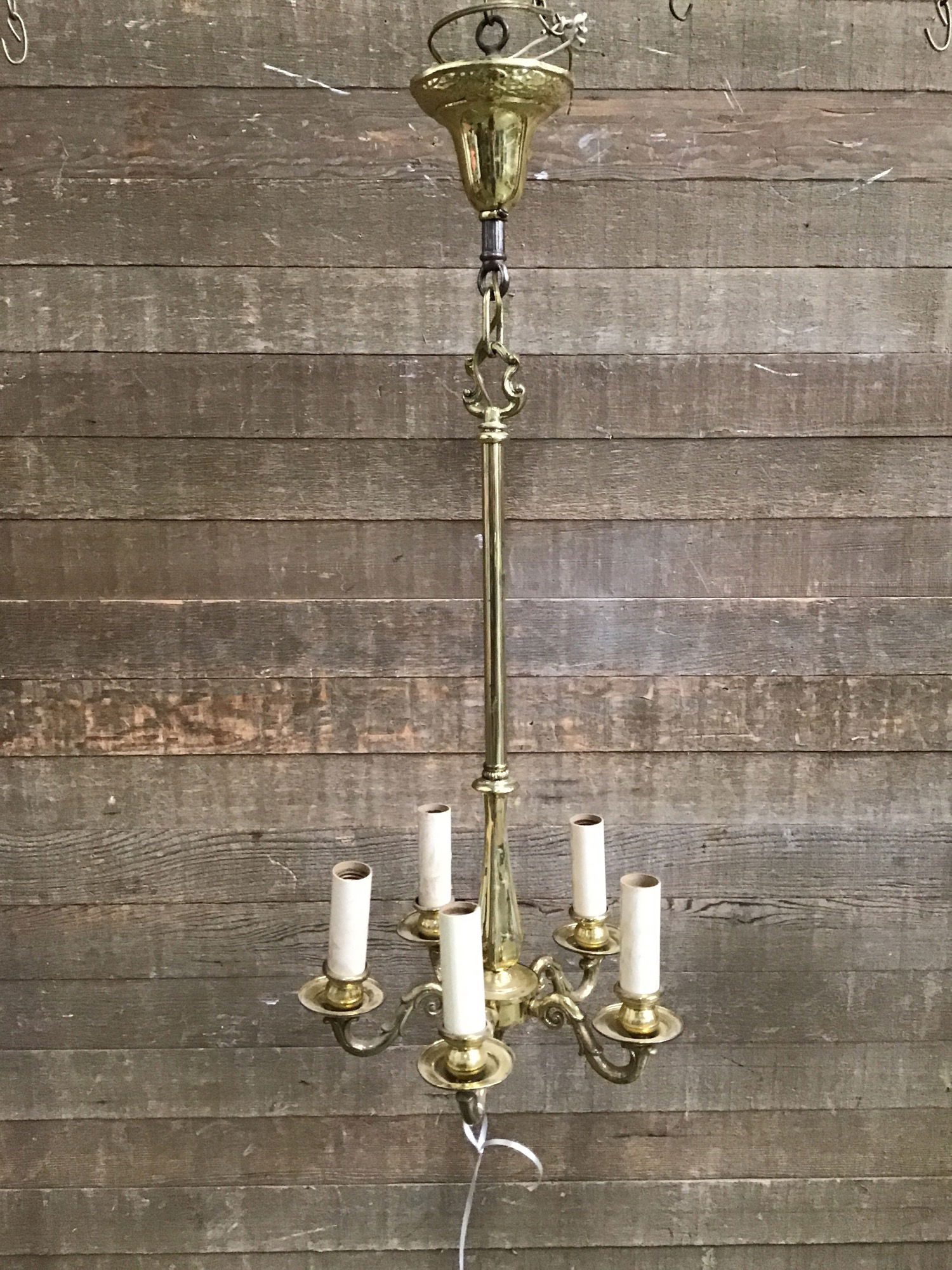 Antique 5 arm brass chandelier with a French vibe to it. In overall great condition for its age. And looks as though it has been rewired at one point, but we recommend a full test before installation. A couple of the plates under the bulbs are a little bent, but it shouldn't be too hard to flatten back out.