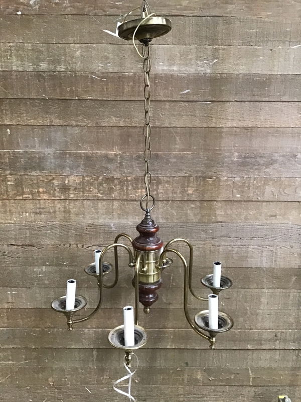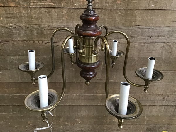 Vintage light, we believe to be from the 60s and is a retro colonial style. It has 6 brass candelabra arms and a wood base. Has original sticker in the canopy and was manufactured by Thomas Industries Inc. Comes with about 18" of chain.
