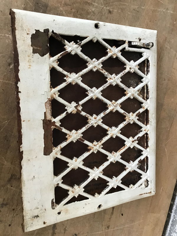 Wall mount, ornate cast iron heat register with operable flap. There's a coat of flaking off white paint on it and the flap has started to rust away, which is reflected in the price.
