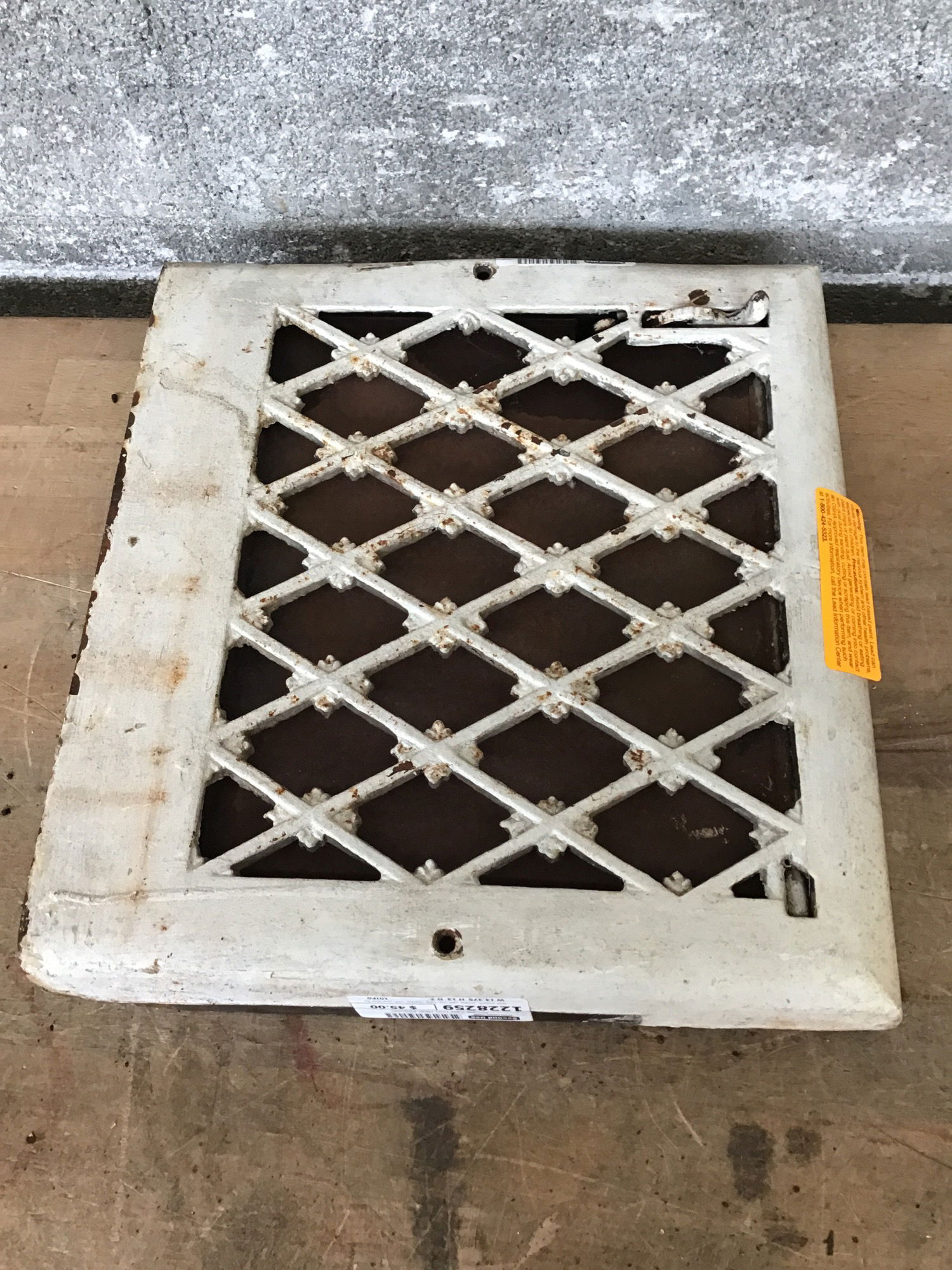 Wall mount, ornate cast iron heat register with operable flap. There's a coat of flaking off white paint on it, which is reflected in the price.