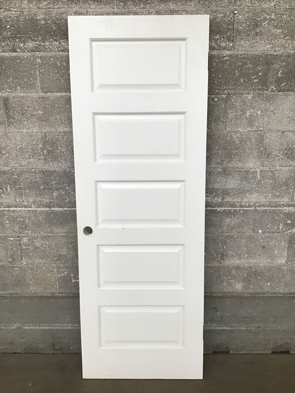 Newer 5-panel painted primed masonite interior door with cutout for modern knobset. Some cosmetic damage that needs a touch up; price reflects.